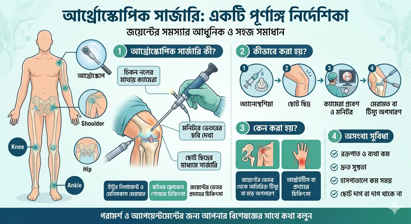 বিশেষ দ্রষ্টব্য: আপনার জয়েন্টের ব্যথা বা সমস্যার ধরন বুঝে একজন অর্থোপেডিক সার্জন ঠিক করবেন আপনার জন্য আর্থ্রোস্কোপিক সার্জারি প্রয়োজন কি না। বাংলাদেশে এখন সরকারি ও বেসরকারি বিশেষায়িত হাসপাতালগুলোতে অত্যন্ত সাশ্রয়ী মূল্যে এই আধুনিক চিকিৎসা সেবা পাওয়া যাচ্ছে।